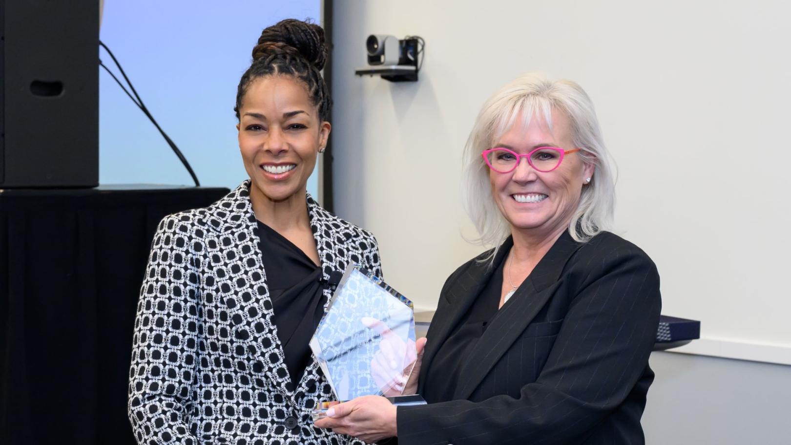 Kendal Whitlock, head of digital optimization for Walgreens Clinical Trials, with Clinical Trials Day Award recipient Peyton Howell, CEO of Parexel