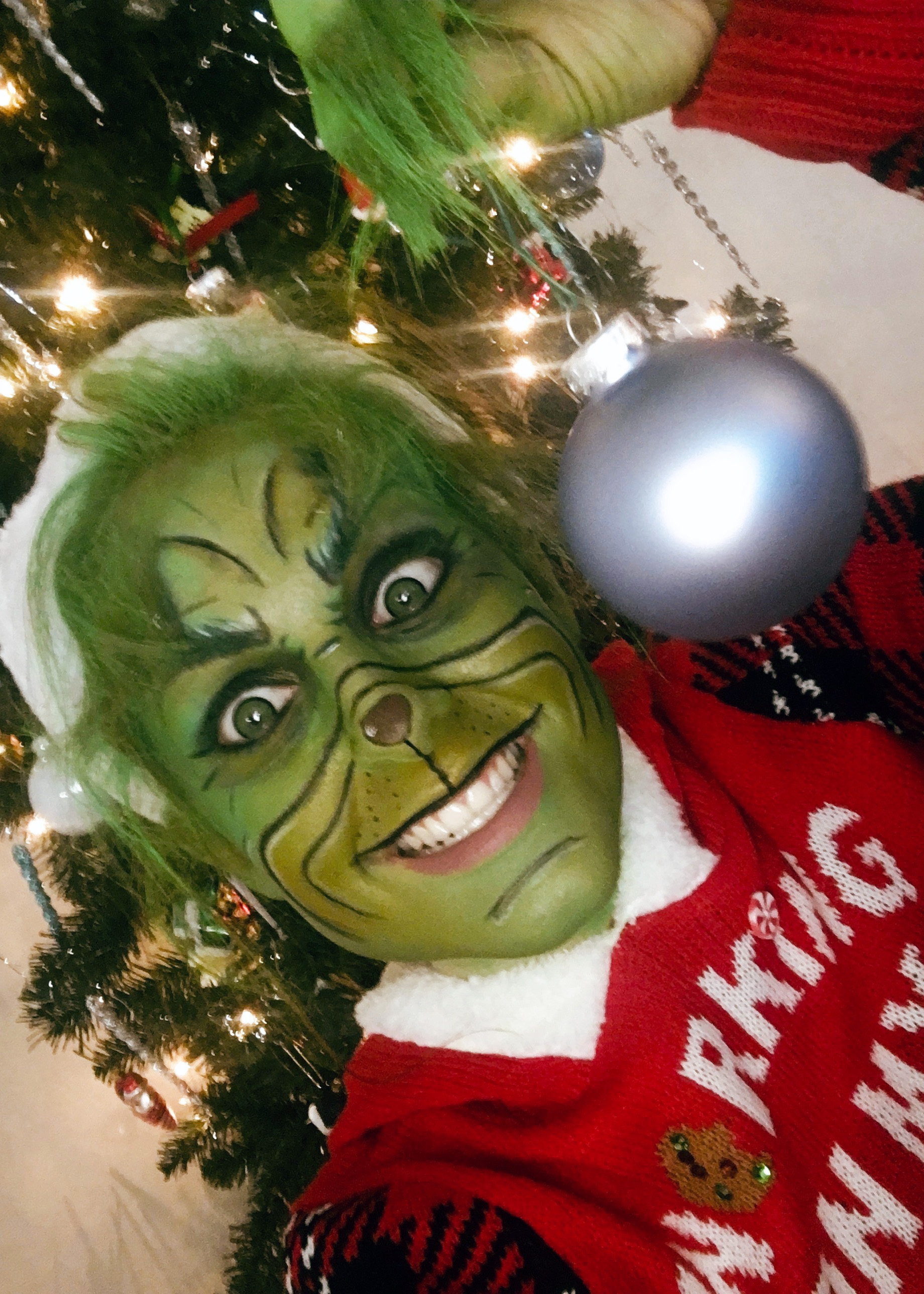 When the holidays arrived, it became Hardesty’s “thing” to go above and beyond with makeup, and she began to expand in-store demos and customer makeovers to include characters and costumes. The week before Christmas, she dressed up every day, drawing sparkly red poinsettias around her eyes and wearing full makeup and costumes to become Jack Frost, Rudolph the Red-Nosed Reindeer and an elf. On Christmas Eve, she came to work as the Grinch, green hairspray and all – from Walgreens, of course.