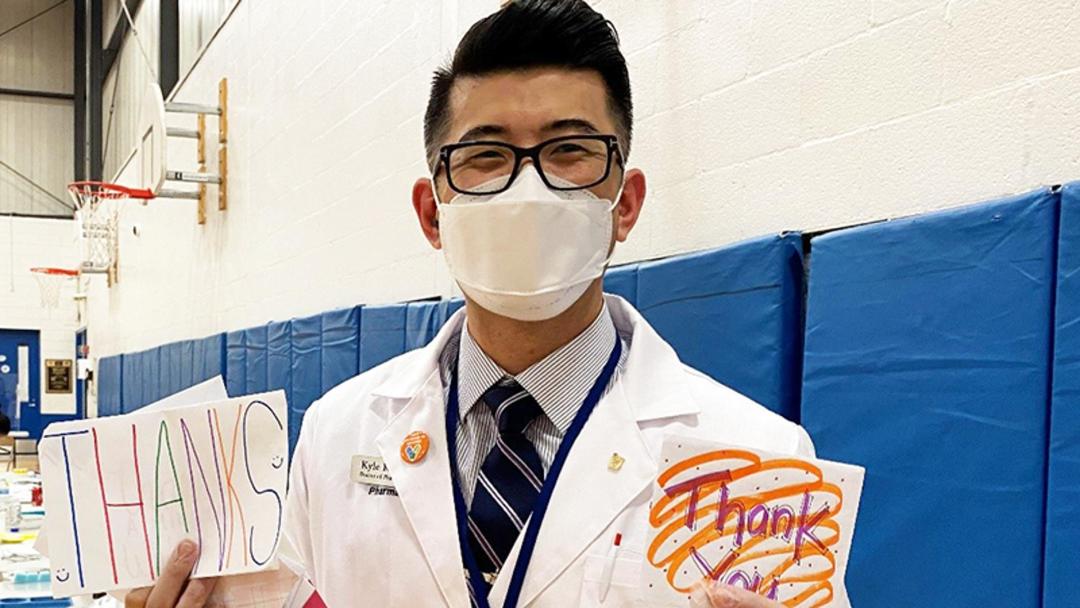 Pharmacist Kyle Kwak holds thank-you cards given to his team from the teachers and staff vaccinated at a COVID-19 vaccine clinic for a school district in Deerfield, Ill.