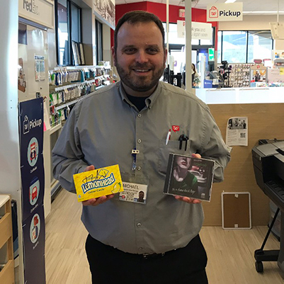 Store manager Mike Ghelfi proudly displays his Lemonheads CD and signed candy box.