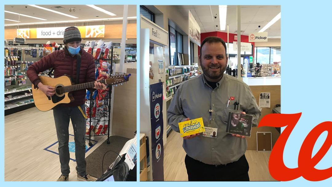 The Lemonheads' Evan Dando (left) gives an impromptu performance at a Walgreens store. Store manager Mike Ghelfi (right) was delighted to be in the "front row."