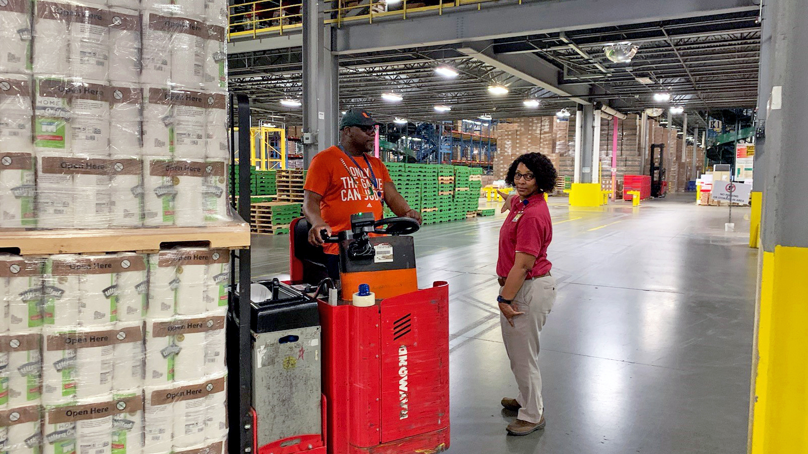 General warehouse team member Clayton Adams (left) and group supervisor Andrea Moore move a pallet stacked with paper towels at the Walgreens distribution center in Jupiter, Fla.