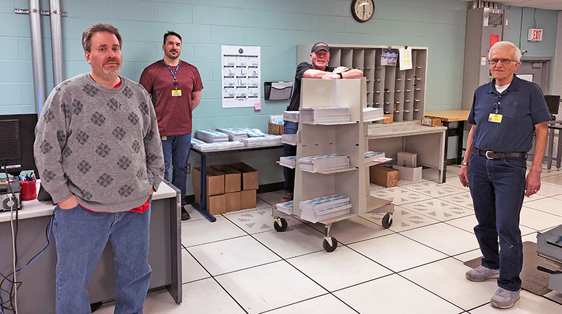 From left: John Gehring, Rick Dresen, Rick Walton and Lloyd Keen stand in front of thousands of shipping labels at the Walgreens distribution center in Windsor, Wis.