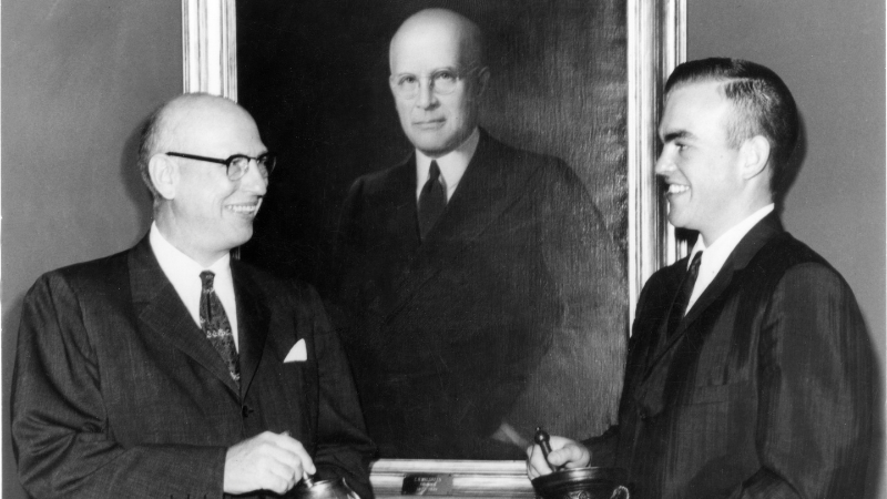 Charles R. Walgreen Jr. (left) stands with son Charles R. (Cork) Walgreen III (right) in front of a portrait of Charles R. Walgreen Sr.
