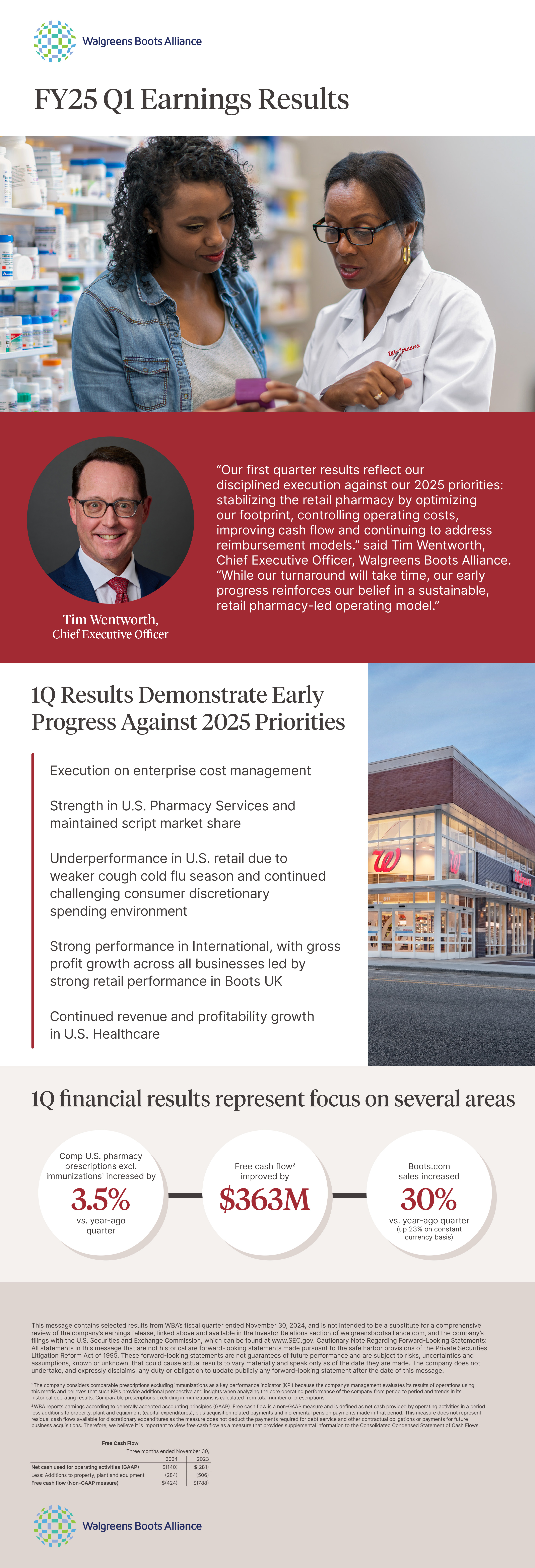 Walgreens Boots Alliance announced its fiscal year 2025 first quarter earnings results. Check out the full press release and the infographic below for highlights.