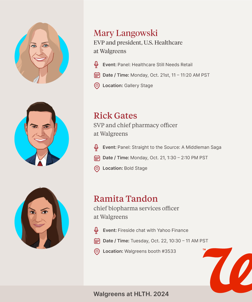 Walgreens again has an impressive lineup of executive speakers heading to HLTH. Mary Langowski, EVP, president of U.S. Healthcare at Walgreens, will take the stage to explore the untapped promise of retail pharmacy during a time of turnaround. Rick Gates, chief pharmacy officer at Walgreens, will also join a panel discussing direct-to-patient models, where he’ll share his perspective on the importance of price transparency and alternative payment models to help improve affordability and access. Finally, at our booth on the expo floor, Ramita Tandon, chief biopharma services officer at Walgreens, will participate in a one-on-one conversation with Anjalee Khemlani from Yahoo Finance sharing more about our clinical trials services and how we’re expanding pharma solutions.