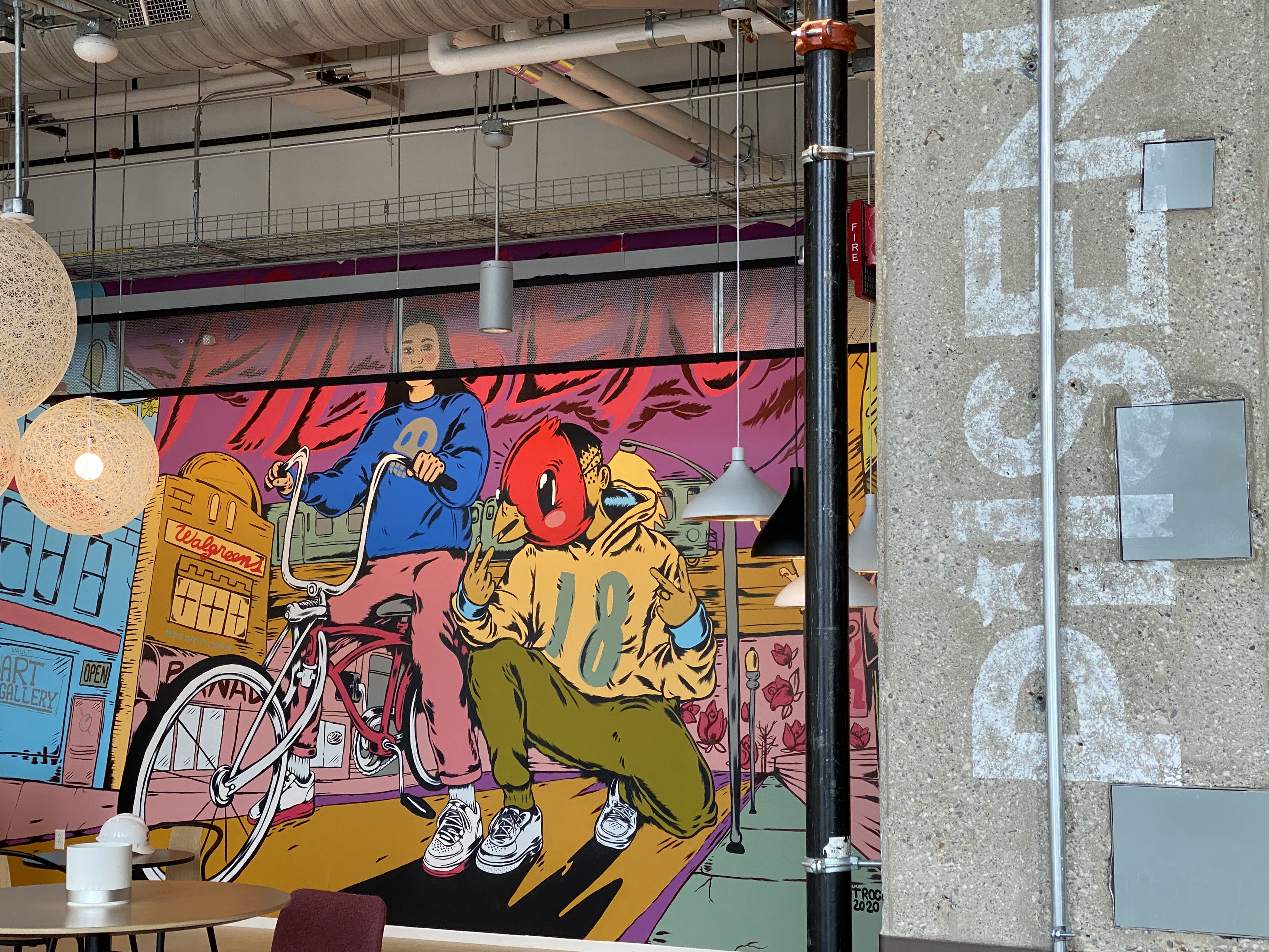 1:53 p.m. Locating my desk after lunch is like trying to remember where I left my car in the Soldier Field parking lot. Dozens of first-come, first-served workspaces allow you to choose between a variety of options: from empty tabletops to areas that hook up to PC or Mac monitors. Some even have the ability to transform into a standing desk at the push of a button. Each department is assigned a “neighborhood,” named after notable Chicago neighborhoods such as Pilsen and Bronzeville. The walls framing each section are marked with bold murals, created by local artists from the respective neighborhoods. Within conference rooms, I find framed Chicago-themed photography, drawings and paintings – the work of our very own team members.