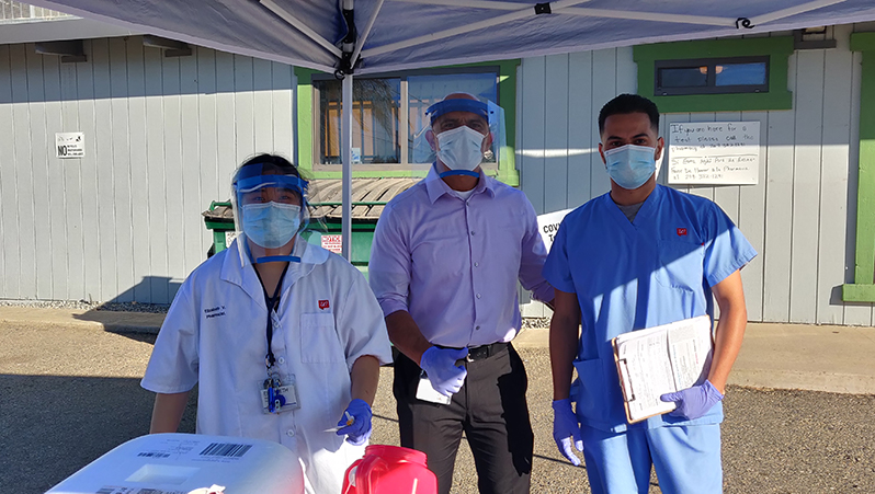 Rodriguez with pharmacist Elizabeth Vo (left) and pharmacy technician Jose Mancilla at Atwater Migrant Center