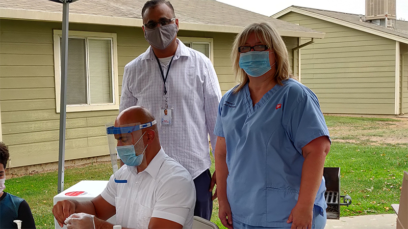 Rodriguez (seated) and Kumar administering vaccines at the Atwater Migrant Center in Merced County, Ca.