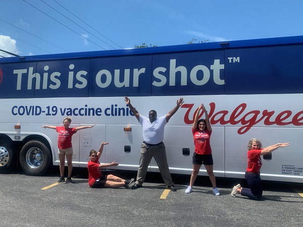 Over the course of eight weeks, Russell drove a bus outfitted with COVID-19 vaccine stations from Washington D.C. to Portland, Ore. At each of the 18 cities on his route, he greeted patients, set up waiting areas and played the role of confidante for those nervous about getting a shot. The cities were selected due to higher concentrations of medically underserved areas, where access to COVID-19 vaccines can often be challenging. Bringing vaccines directly to neighborhoods where they’re needed most, paired with the freedom of offering walk-up appointments, is one of the latest tactics Walgreens has used to advance vaccine equity.