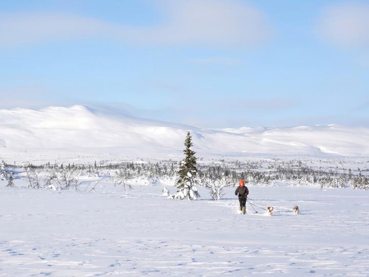 Three hours later, Gjerpen pulled into the parking area at the base of the mountain and announced their arrival to wagging tails. She stepped out of the car and into her cross-country skis – click, click. The dogs, strapped in harnesses (the signature element of a form of cross-country skiing called skikjøring), guided her along a 1-kilometer path of fresh powder to her cabin – which has no electricity or running water. Frigid air filled their lungs with each breath. It was minus 15 degrees Celsius (5 degrees Fahrenheit).