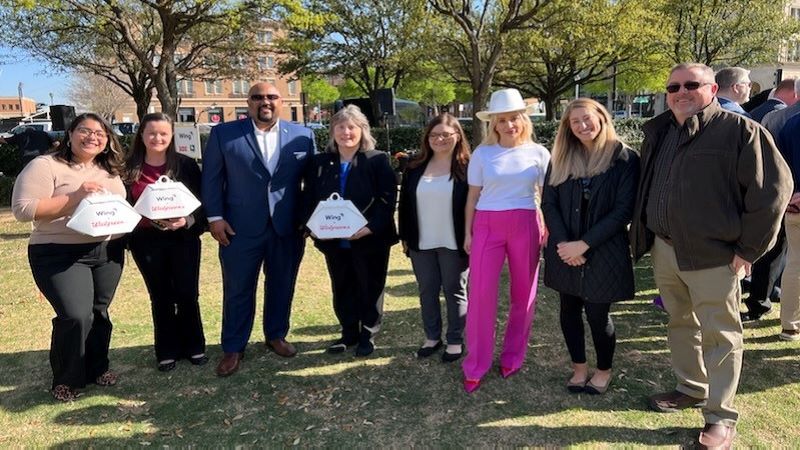 Walgreens team members with Little Elm Mayor Curtis J. Cornelious, third from left, and Debbie Saylor, fourth from left, at the Walgreens and Wing drone delivery service launch.