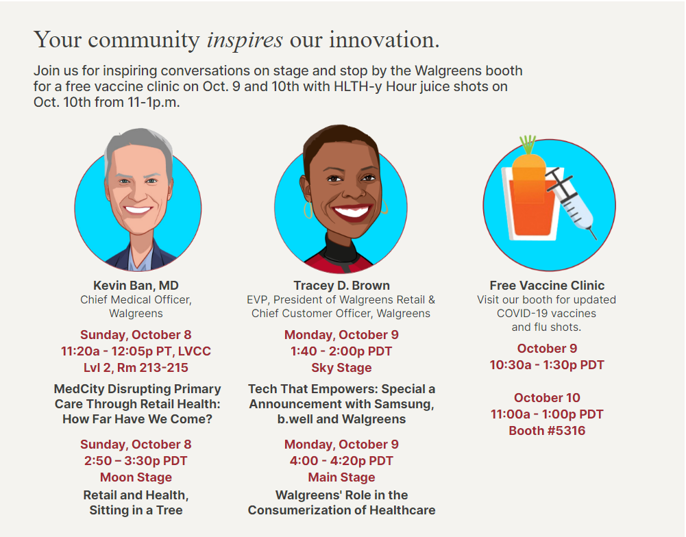 During Tuesday’s on-site vaccine clinic, from 11 a.m. to 1 p.m., enjoy a revitalizing “Healthy Hour” where you can enjoy refreshments while learning more about Walgreens extensive range of healthcare offerings. We believe that taking charge of your health should be convenient and accessible, especially at HLTH.