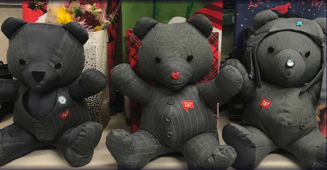 Teddy bears made out of Mark Wilczek’s store manager vest that were gifted to his family for Christmas in 2020.