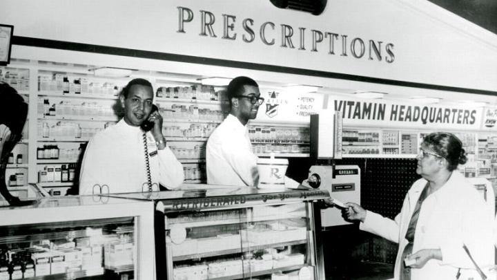 Pharmacist Oliver Butler, center, completes a sale next to store manager Clovis Williams at a Chicago Walgreens in 1962.