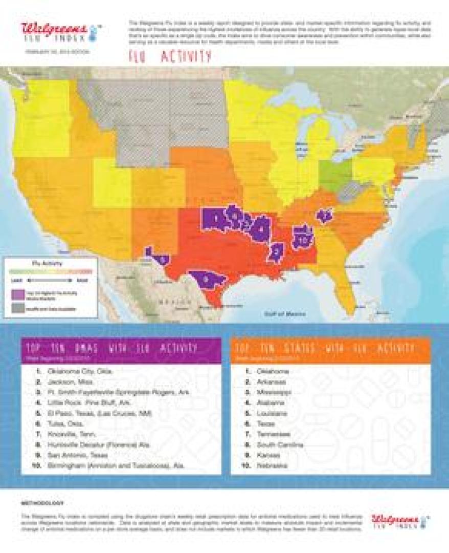 DEERFIELD, Ill., February 24, 2015 - The Walgreens Flu Index™ is a weekly report developed to provide state- and market-specific information regarding flu activity, and ranking of those experiencing the highest incidences of influenza across the country. With the ability to generate hyper-local data that’s as specific as a single zip code, the Index aims to drive consumer awareness and prevention within communities, while also serving as a valuable resource for health departments, media and others at the local level.