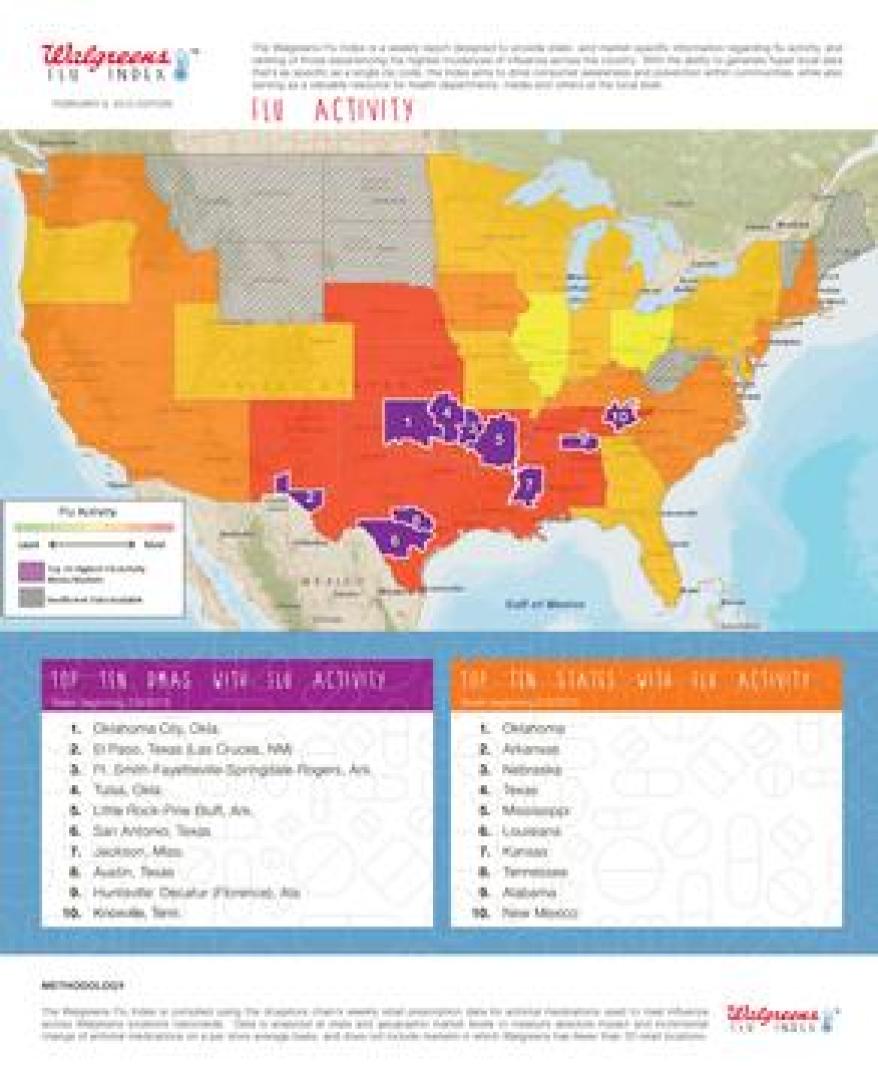 DEERFIELD, Ill., February 10, 2015 - The Walgreens Flu Index™ is a weekly report developed to provide state- and market-specific information regarding flu activity, and ranking of those experiencing the highest incidences of influenza across the country. With the ability to generate hyper-local data that’s as specific as a single zip code, the Index aims to drive consumer awareness and prevention within communities, while also serving as a valuable resource for health departments, media and others at the local level.