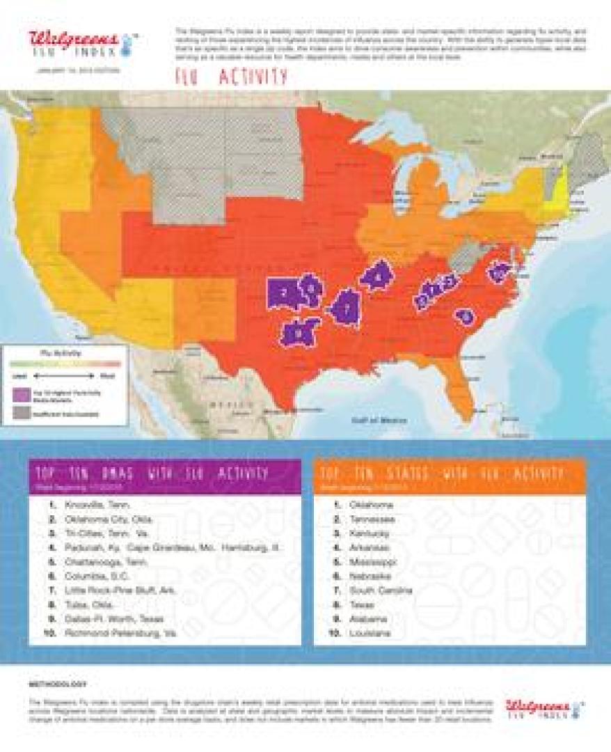 DEERFIELD, IL. – Jan. 13, 2015 - The Walgreens Flu Index™ is a weekly report developed to provide state- and market-specific information regarding flu activity, and ranking of those experiencing the highest incidences of influenza across the country. With the ability to generate hyper-local data that’s as specific as a single zip code, the Index aims to drive consumer awareness and prevention within communities, while also serving as a valuable resource for health departments, media and others at the local level.