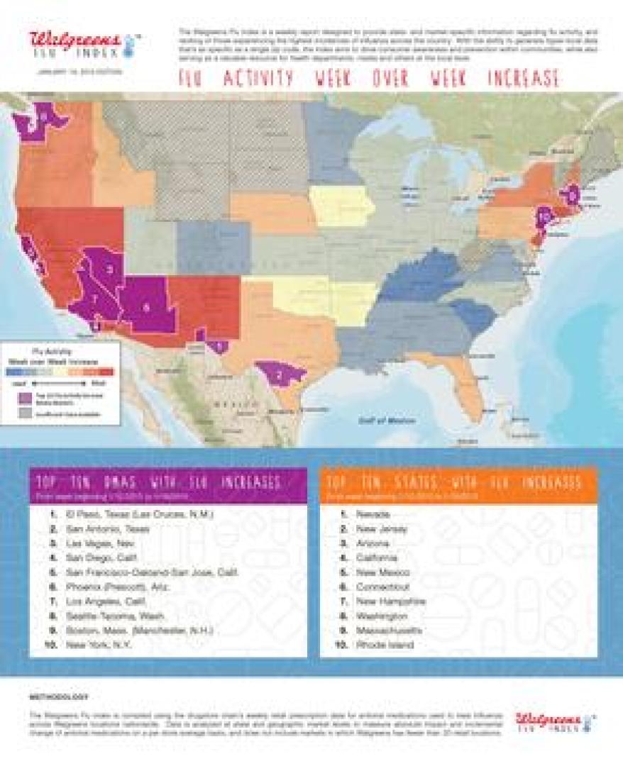 DEERFIELD, Ill., January 20, 2015 - The Walgreens Flu Index™ is a weekly report developed to provide state- and market-specific information regarding flu activity, and ranking of those experiencing the highest incidences of influenza across the country. With the ability to generate hyper-local data that’s as specific as a single zip code, the Index aims to drive consumer awareness and prevention within communities, while also serving as a valuable resource for health departments, media and others at the local level.