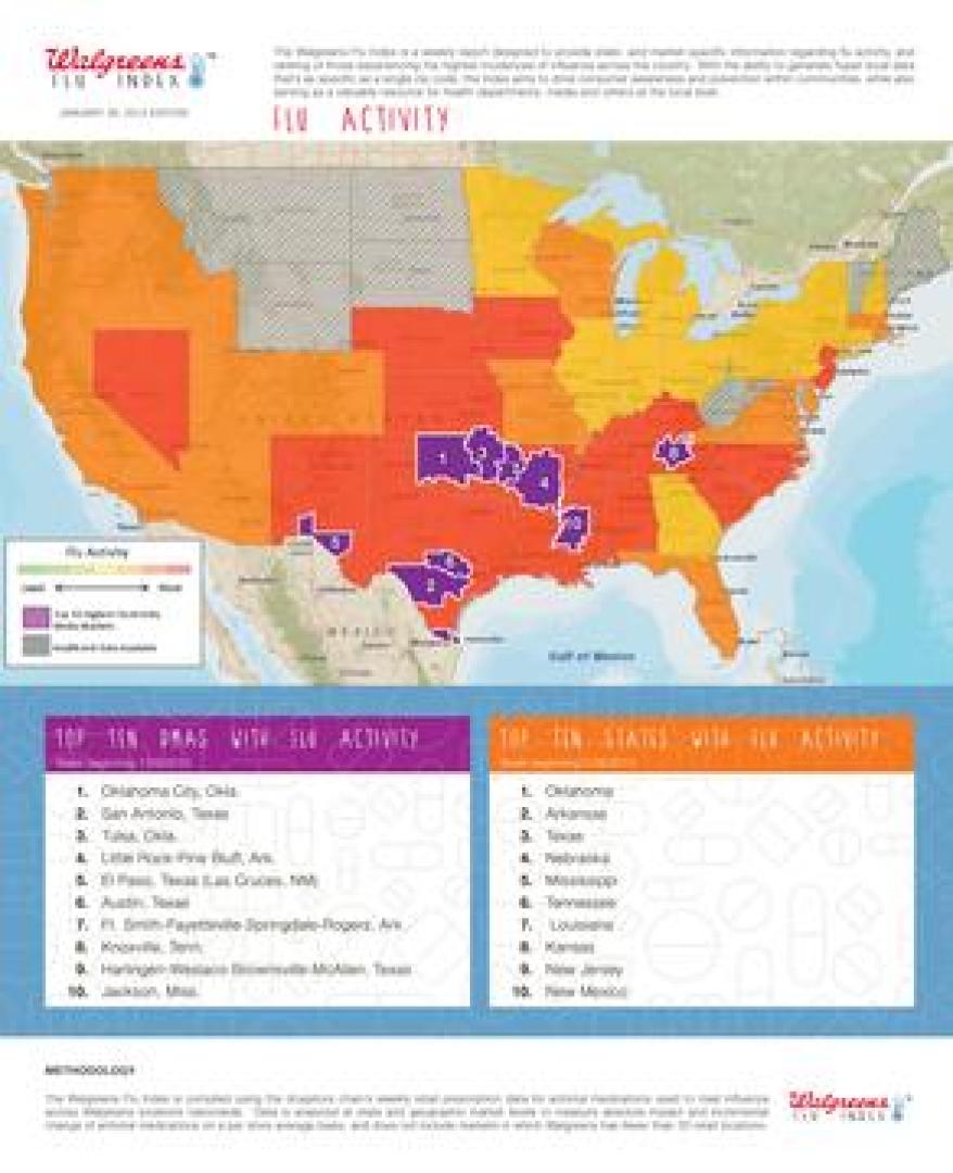 DEERFIELD, Ill., January 27, 2015 - The Walgreens Flu Index™ is a weekly report developed to provide state- and market-specific information regarding flu activity, and ranking of those experiencing the highest incidences of influenza across the country. With the ability to generate hyper-local data that’s as specific as a single zip code, the Index aims to drive consumer awareness and prevention within communities, while also serving as a valuable resource for health departments, media and others at the local level.