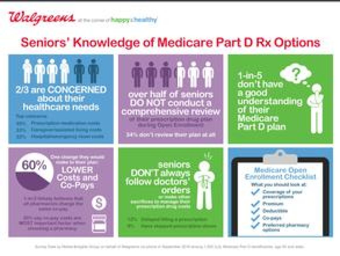 DEERFIELD, Ill., October 31, 2016 - One of the most important and, for some, puzzling times of year is the Medicare annual enrollment period, when more than 55 million Americans are able to evaluate and enroll in Medicare Advantage or prescription drug plans. Among the top concerns for Medicare beneficiaries today is prescription drug costs, according to a new Walgreens survey. However, more than one-third (34 percent) say they aren’t taking time to review their prescription drug plan prior to renewing it and almost one-in-five (19 percent) don’t have a good understanding of their plan.