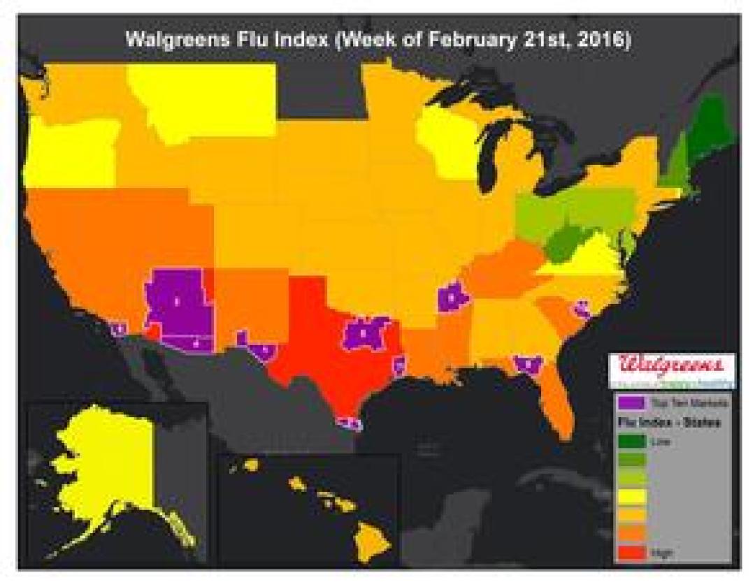 DEERFIELD, Ill., February 25, 2016 - The Walgreens Flu Index™ is a weekly report developed to provide state- and market-specific information, and ranking of those experiencing the highest incidences of influenza across the country. This week, Walgreens Flu Index data is tracking increased flu activity in the South and West regions of the U.S.