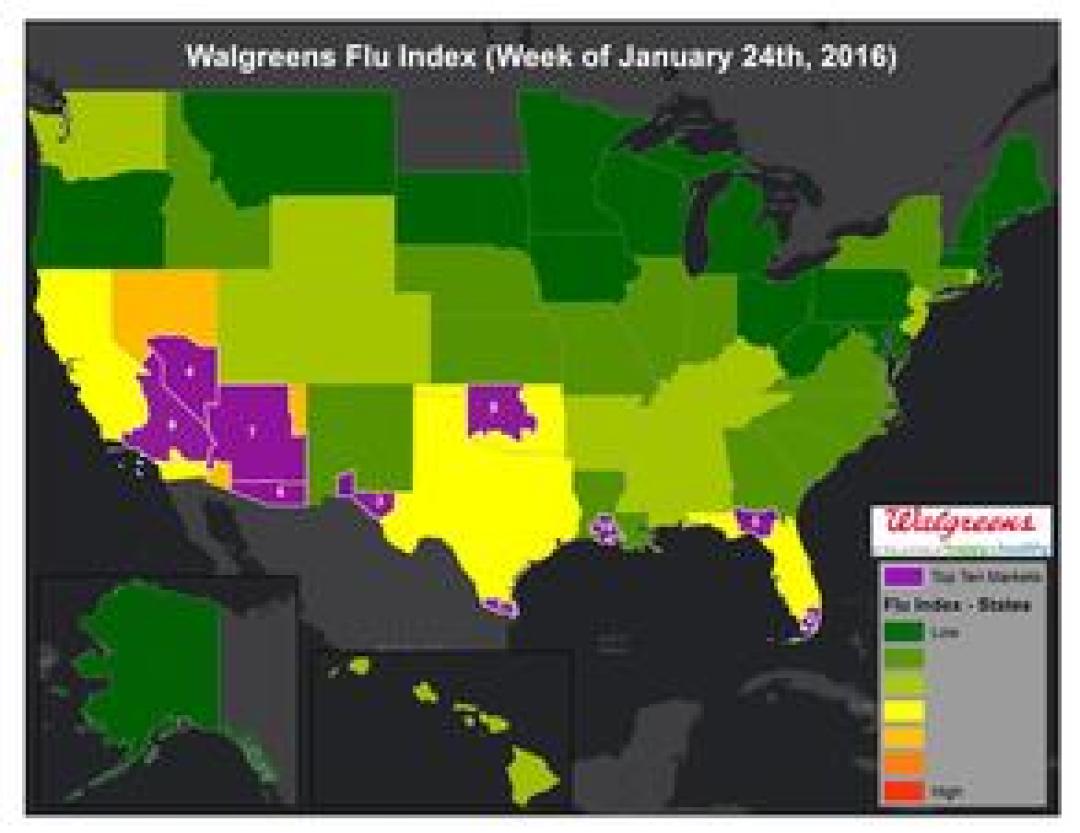 DEERFIELD, Ill., January 28, 2016 - The Walgreens Flu Index™ is a weekly report developed to provide state- and market-specific information, and ranking of those experiencing the highest incidences of influenza across the country. The Flu Index does not provide data measuring actual levels or severity of flu activity, but rather, illustrates which populations are experiencing the most incidences each week based on Index methodology.