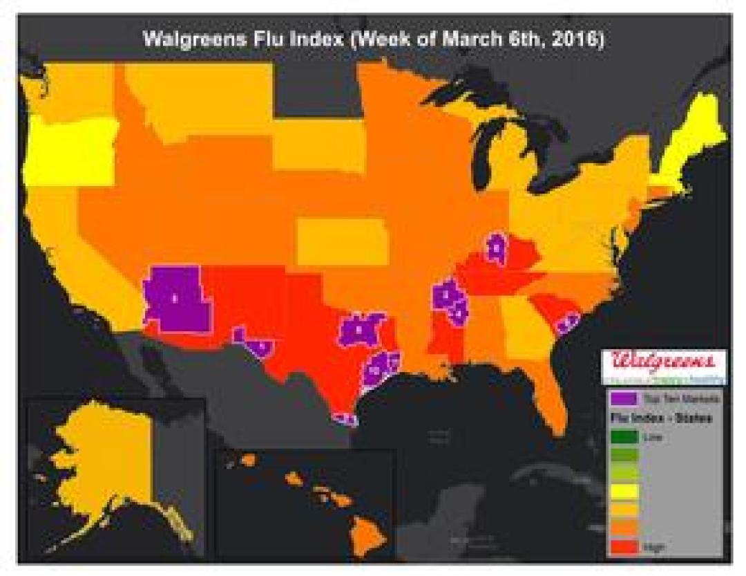 DEERFIELD, Ill., March 10, 2016 - The Walgreens Flu Index™ is a weekly report developed to provide state- and market-specific information regarding flu activity, and ranking of those experiencing the highest incidences of influenza across the country.