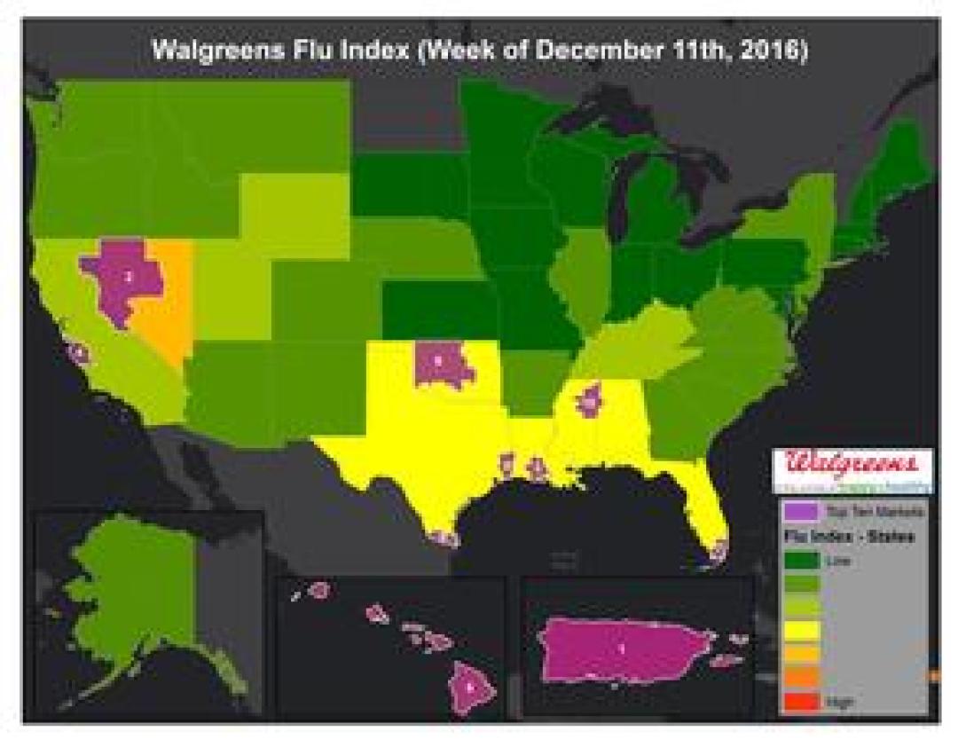 DEERFIELD, Ill., December 15, 2016 - Walgreens today launched its first Flu Index™ for the 2016-17 season, a weekly report that ranks the top markets and states for flu activity in the U.S. This year’s Flu Index will include Puerto Rico for the first time.