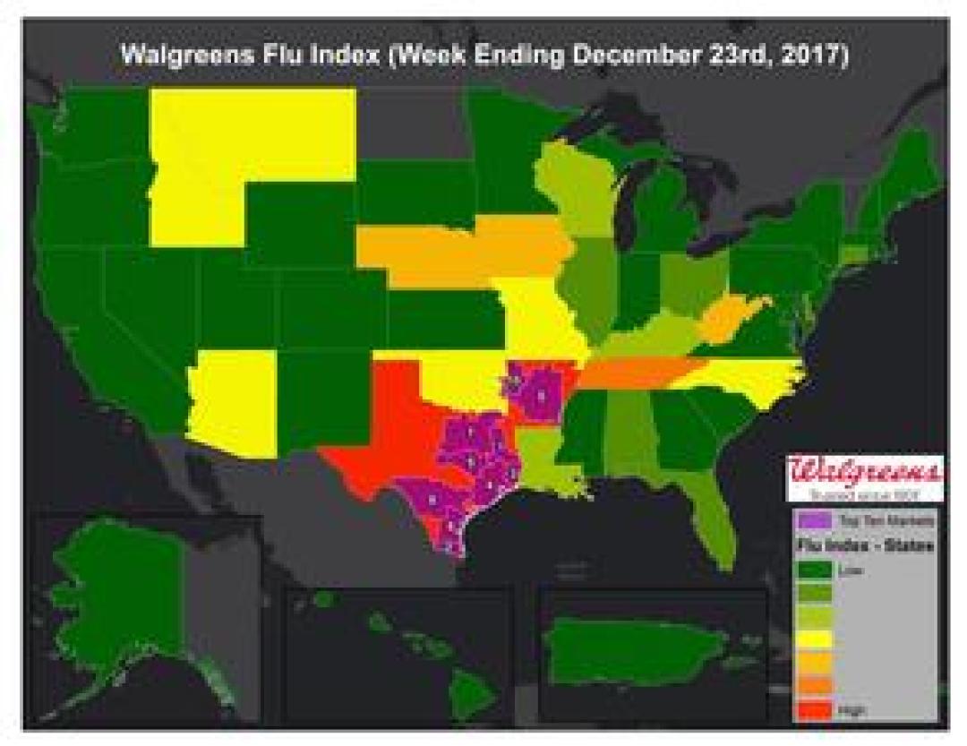 DEERFIELD, Ill., December 27, 2017 - The Walgreens Flu Index™ is a weekly report developed to provide state- and market-specific information regarding flu activity, and ranks those states and markets experiencing the highest incidences of influenza across the country.
