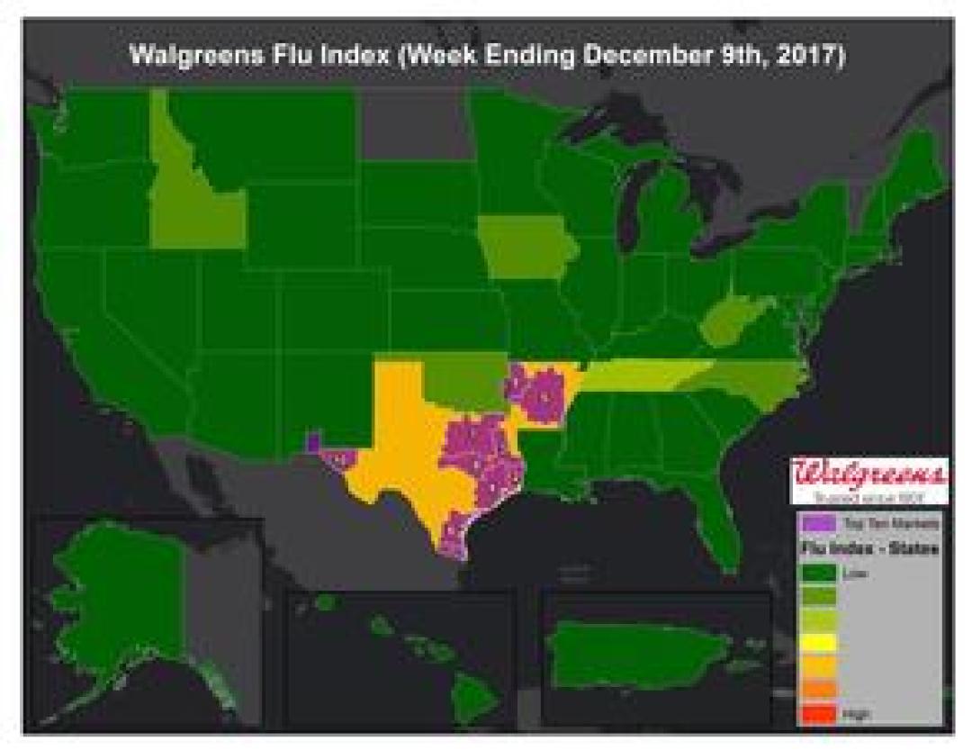 DEERFIELD, Ill., December 13, 2017 - The Walgreens Flu Index™ is a weekly report developed to provide state- and market-specific information regarding flu activity, and ranks those states and markets experiencing the highest incidences of influenza across the country.