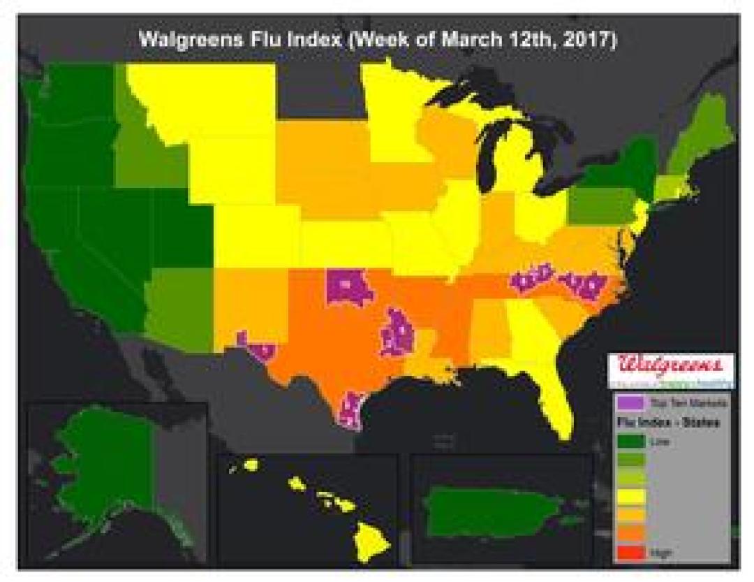 DEERFIELD, Ill., March 15, 2017 - The Walgreens Flu Index™ is a weekly report developed to provide state- and market-specific information regarding flu activity, and ranking of those experiencing the highest incidences of influenza across the country.