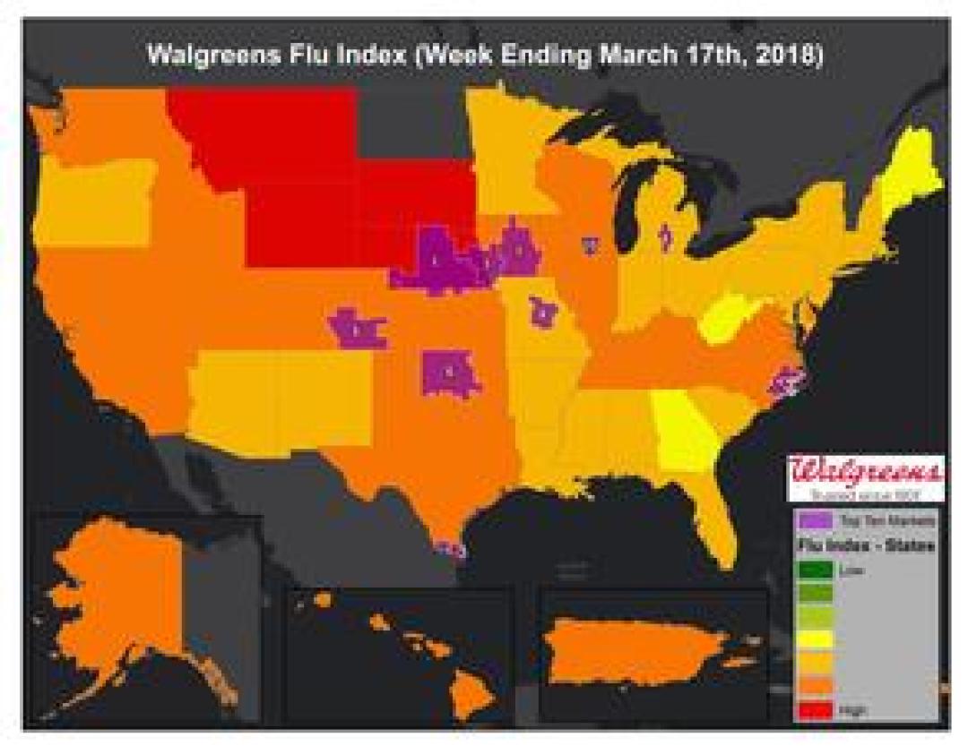 DEERFIELD, Ill., March 21, 2018 - The Walgreens Flu Index™ is a weekly report developed to provide state- and market-specific information regarding flu activity, and ranks those states and markets experiencing the highest incidences of influenza across the country.