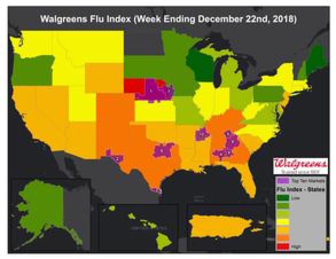 DEERFIELD, Ill., December 28, 2018 - The Walgreens Flu Index™ is a weekly report developed to provide state- and market-specific information regarding flu activity, and ranks those states and markets experiencing the highest incidences of influenza across the country.