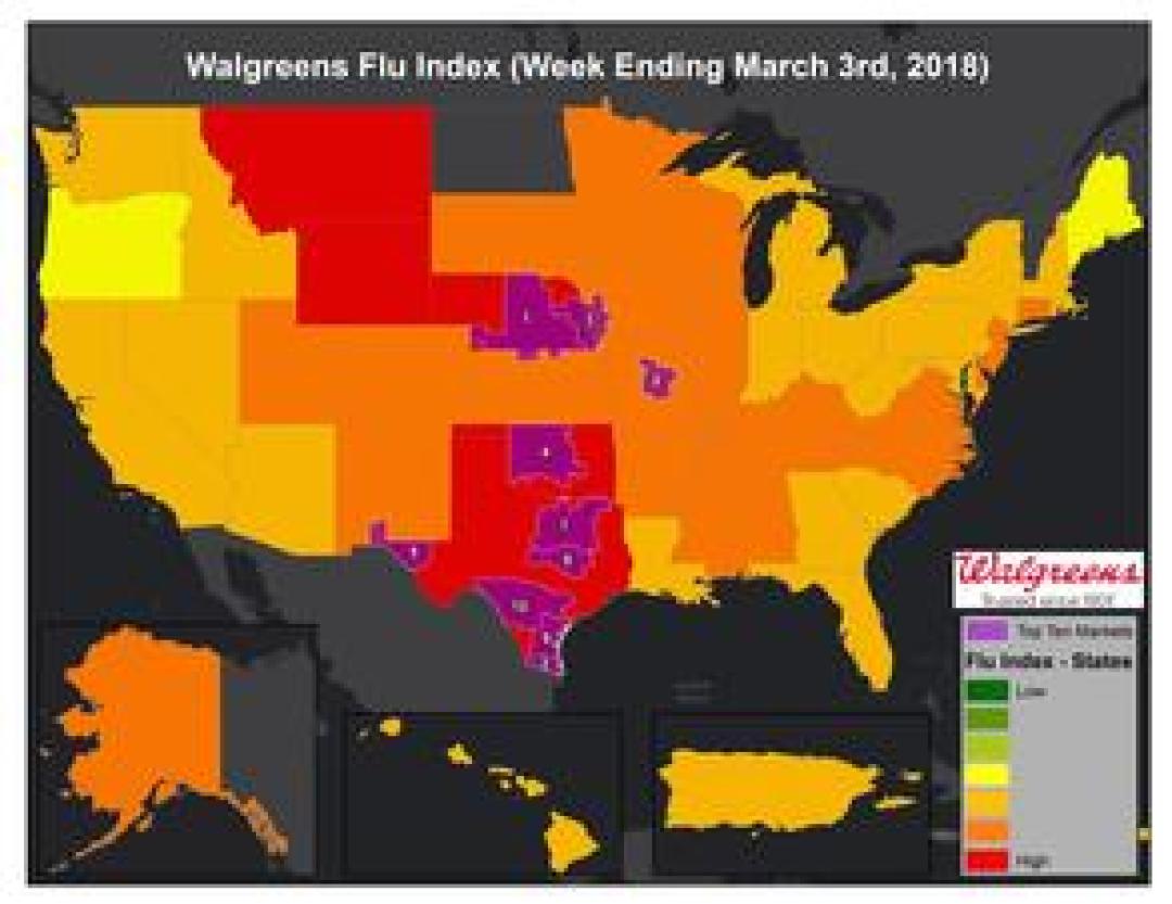 DEERFIELD, Ill., March 07, 2018 - The Walgreens Flu Index™ is a weekly report developed to provide state- and market-specific information regarding flu activity, and ranks those states and markets experiencing the highest incidences of influenza across the country.