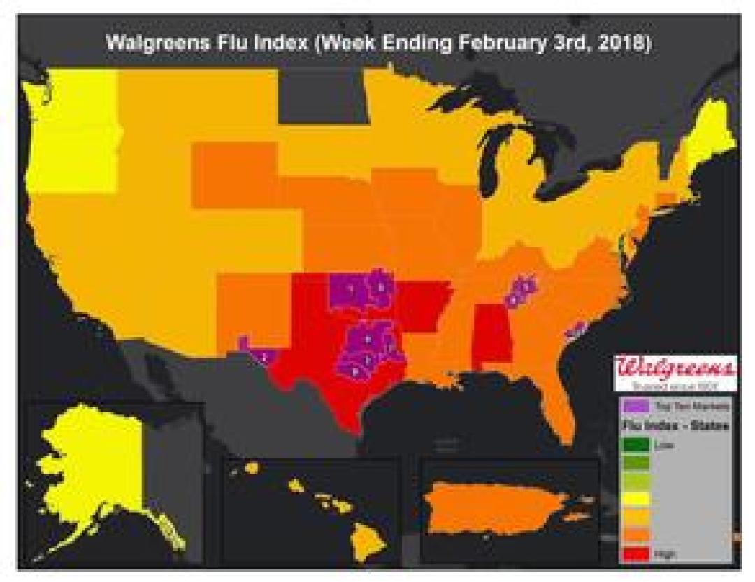 DEERFIELD, Ill., February 07, 2018 - The Walgreens Flu Index™ is a weekly report developed to provide state- and market-specific information regarding flu activity, and ranks those states and markets experiencing the highest incidences of influenza across the country.