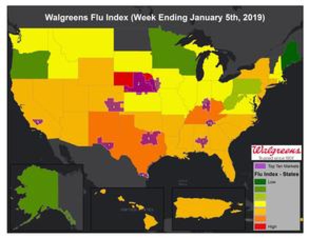 DEERFIELD, Ill., January 09, 2019 - The Walgreens Flu Index™ is a weekly report developed to provide state- and market-specific information regarding flu activity, and ranks those states and markets experiencing the highest incidences of influenza across the country.