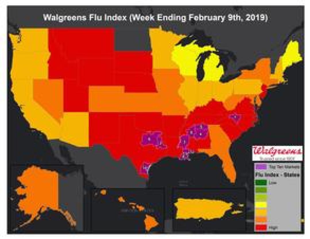 DEERFIELD, Ill., February 13, 2019 - The Walgreens Flu Index™ is a weekly report developed to provide state- and market-specific information regarding flu activity, and ranks those states and markets experiencing the highest incidences of influenza across the country.