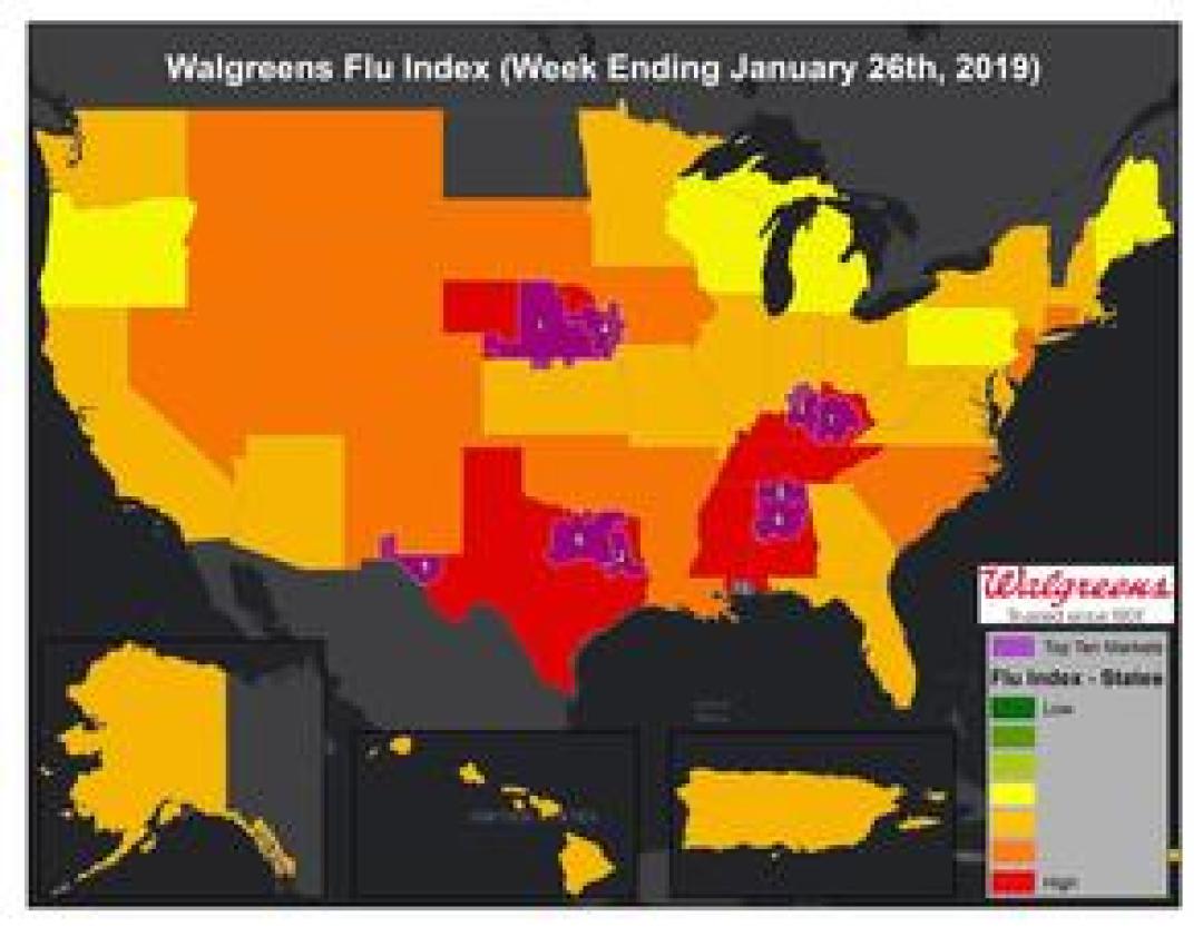 DEERFIELD, Ill., January 30, 2019 - The Walgreens Flu Index™ is a weekly report developed to provide state- and market-specific information regarding flu activity, and ranks those states and markets experiencing the highest incidences of influenza across the country.