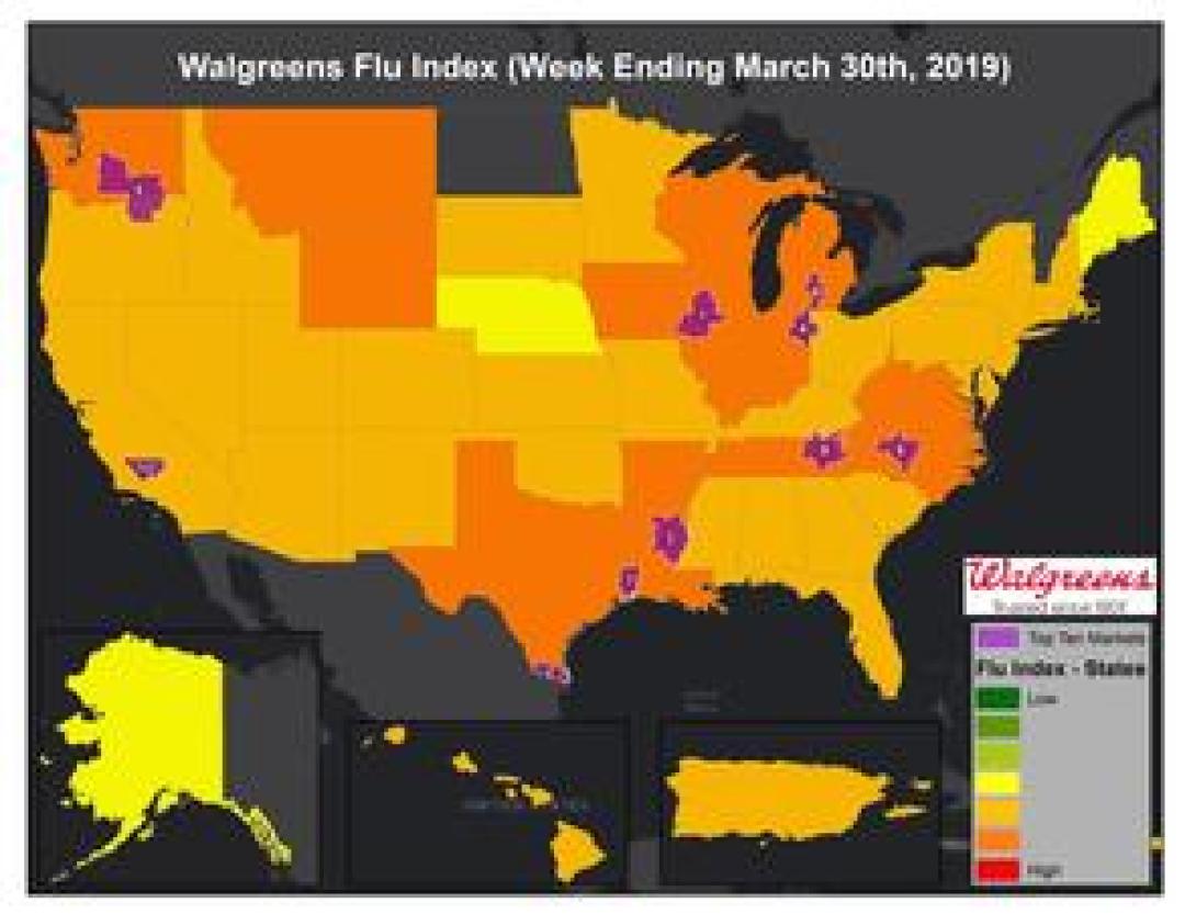 DEERFIELD, Ill., April 03, 2019 - The Walgreens Flu Index™ is a weekly report developed to provide state- and market-specific information regarding flu activity, and ranks those states and markets experiencing the highest incidences of influenza across the country.
