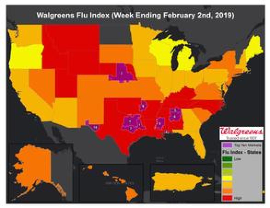DEERFIELD, Ill., February 06, 2019 - The Walgreens Flu Index™ is a weekly report developed to provide state- and market-specific information regarding flu activity, and ranks those states and markets experiencing the highest incidences of influenza across the country.