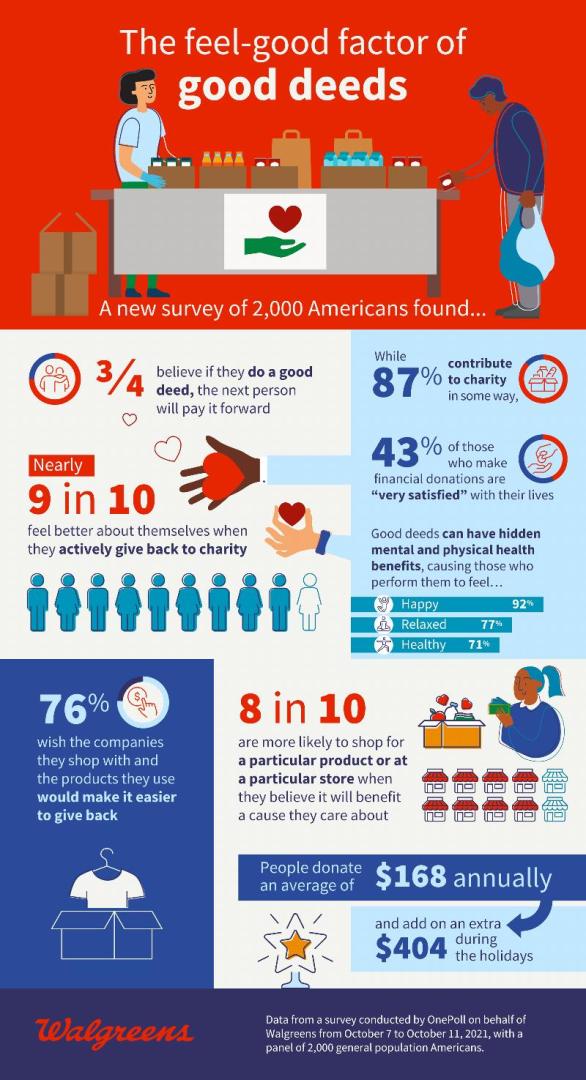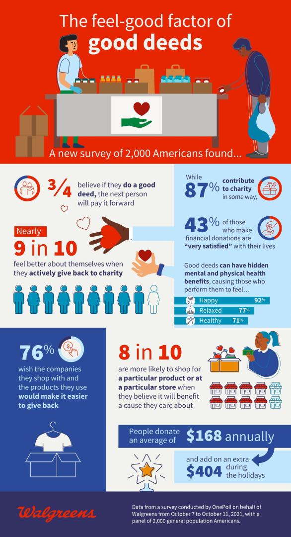 More than three-quarters (76%) of Americans believe if they do a good deed, the next person will pay it forward, according to a recent Walgreens survey. Doing a “good deed” is now made easy with the myWalgreens Credit Card, which allows users to donate their rewards to national and local charities so they can feel even better about their holiday shopping this year.