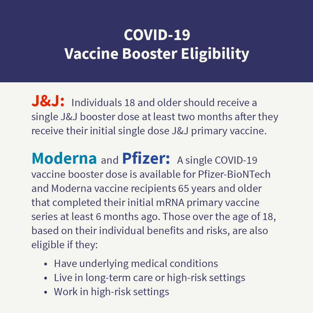 - J&J COVID-19 Booster Eligibility: A single vaccine booster dose is recommended for individuals 18 and older who received a J&J primary dose at least 2 months after they receive their initial J&J primary vaccine dose.
