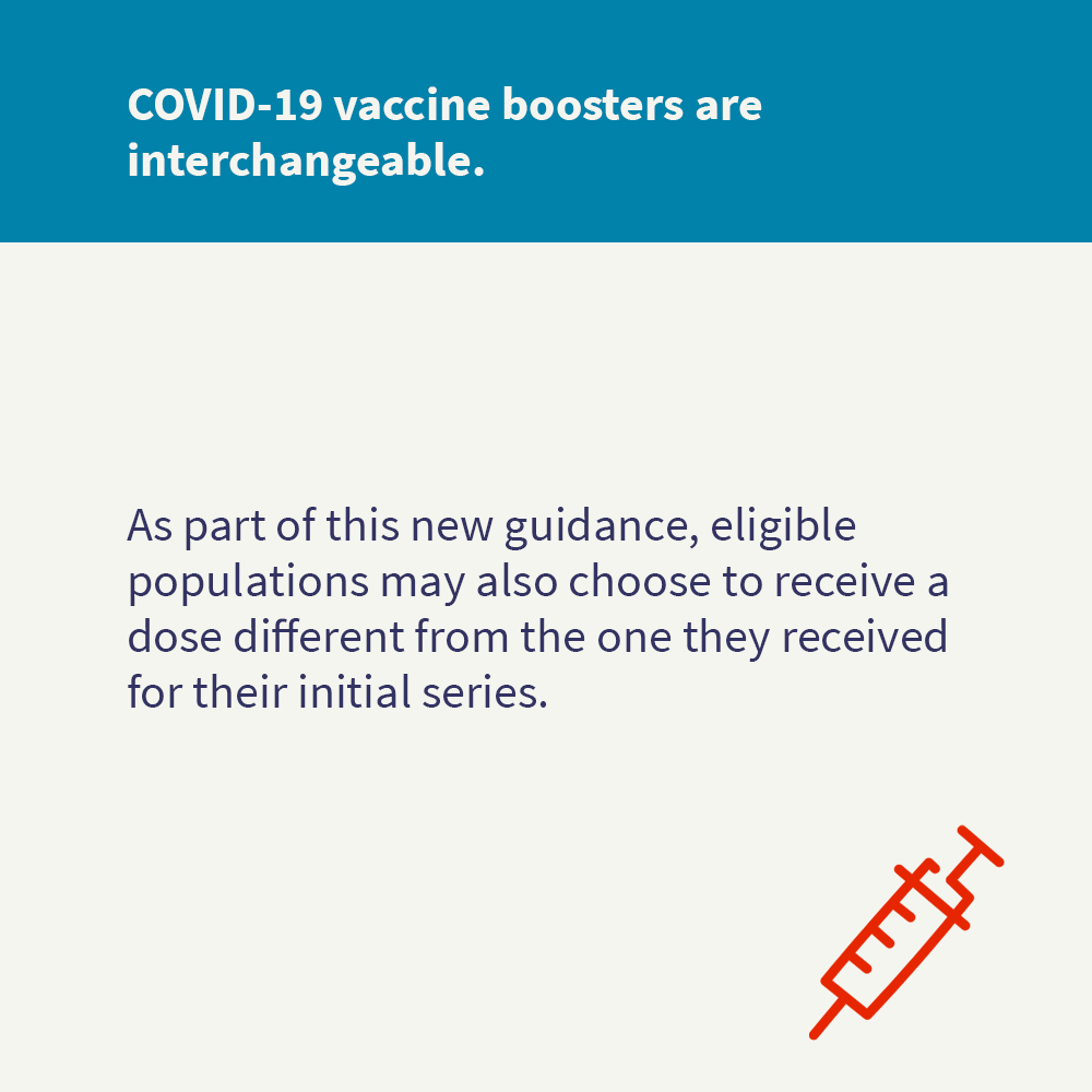 - Mix & Match Guidance: In general, it is recommended individuals receive the same product for their booster dose as they did for their primary series.