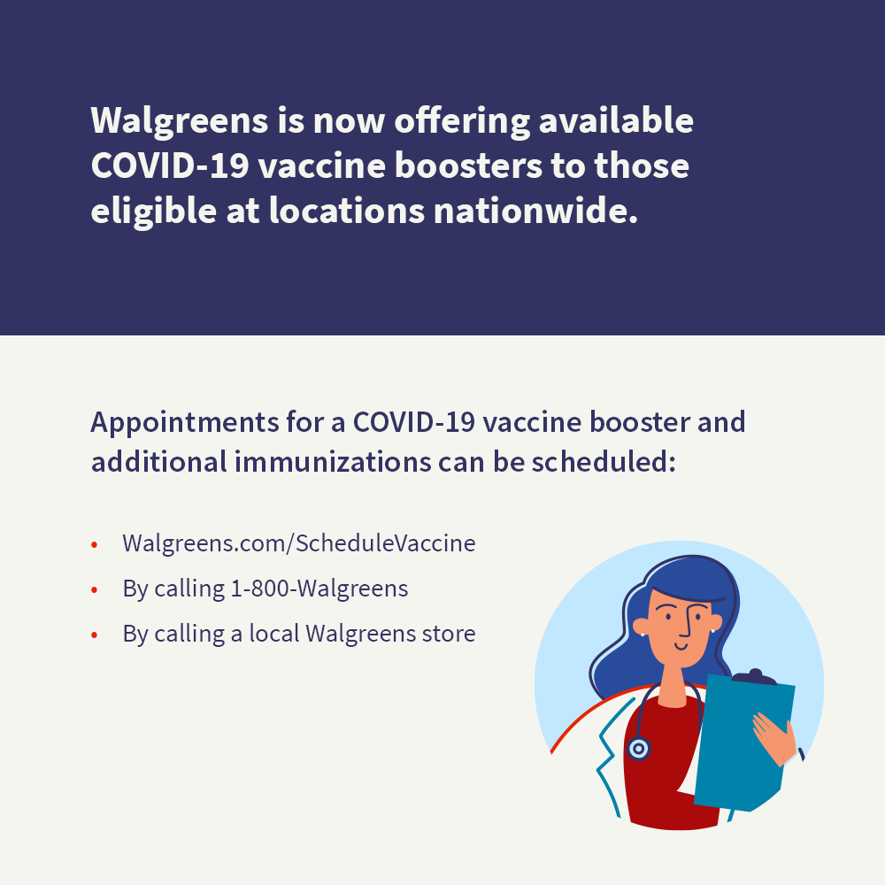 Appointments for COVID-19 vaccines, booster shots and additional immunizations can be scheduled through Walgreens.com/ScheduleVaccine, by calling 1-800-Walgreens or by calling a local Walgreens store. Individual vaccine availability will vary by location.
