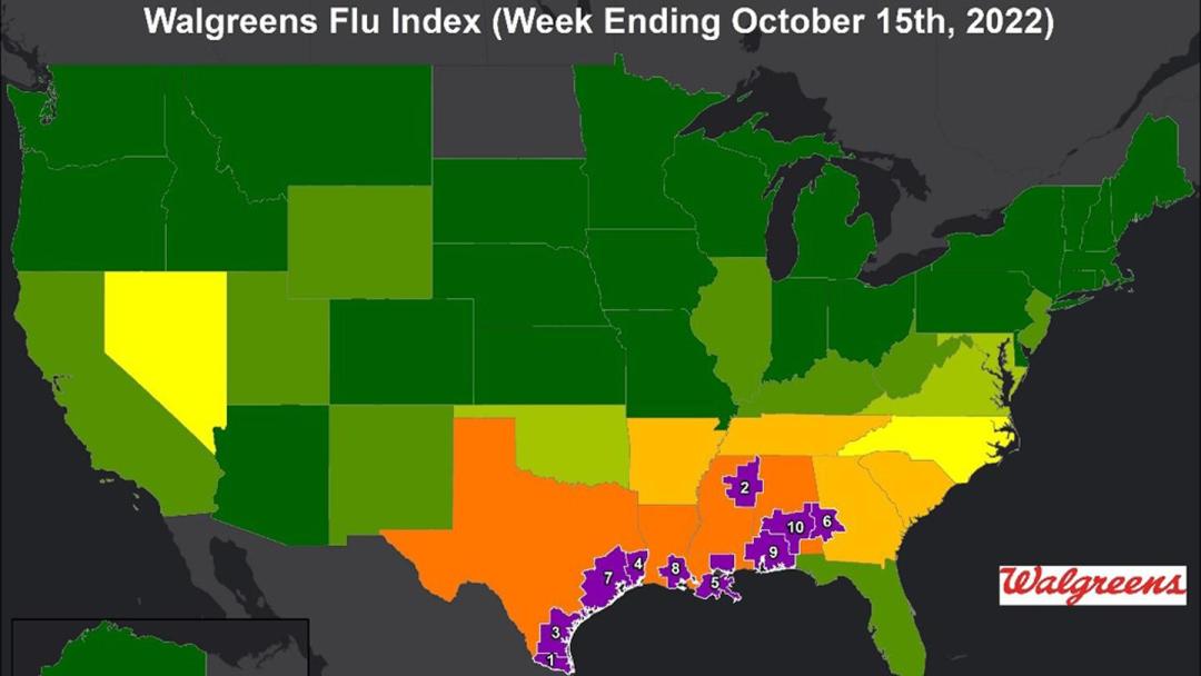 DEERFIELD, Ill., October 24, 2022 - Today Walgreens launched the 2022-2023 Walgreens Flu Index to help communities track flu activity in their area and serve as an important reminder to get protected with an annual flu shot. Returning for its ninth season, the Walgreens Flu Index shows that to date, overall flu activity is more than 10 times higher nationwide when compared to the 2021-2022 flu season and has more than doubled over the past two weeks.