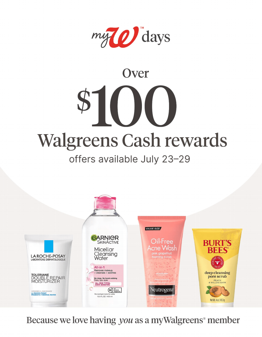*$100 Walgreens Cash rewards is based on members taking advantage of the available offers each day of myW™ days. Complete details, including Walgreens Cash rewards expiration dates, at myWalgreens.com.